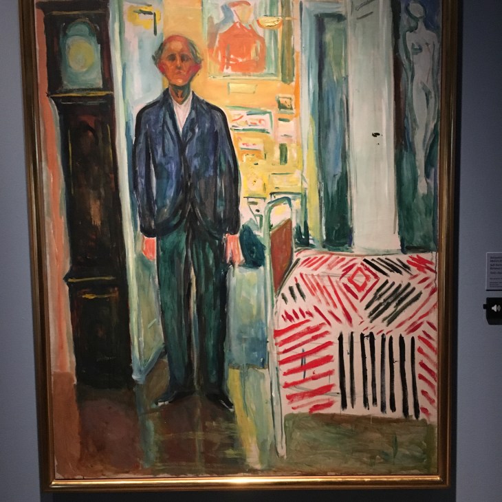 It is good to see Self-Portrait between the Clock and the Bed (1940-43), his last significant work, whose cross hatched bedspread inspired several works for Jasper Johns. Munch, clearly aging, is stood at attention next to a casement clock, the symbolism of transience clear. In the background are various paintings by Munch, presumably including those he left to the City of Oslo. His face echoes the clock face. The bed is where he will die, having read Dostoevsky’s The Devils. Alongside it are three other paintings, taking him back in time via the clinic in Copenhagen to smoking a cigarette. Munch actually appears in a lot of the paintings, either as himself or as an avatar.