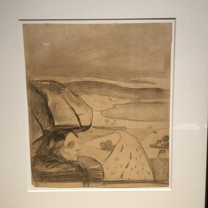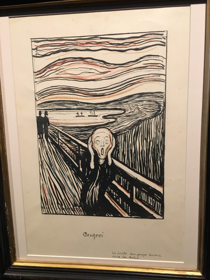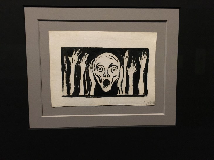That being said, I’ve seen most of it before, but I’m not sure I’ve seen this hand coloured lithograph of The Scream, although the standard lithograph was in London. The paintings don’t travel, as they have been stolen too often. The red ink gets us closer to the blood red sky and it’s good to see two versions of Angst, which juxtaposes the pedestrians of Evening on Karl Johans with the surreal sky. I’ve seen the drawing of The Scream with multiple hands before.