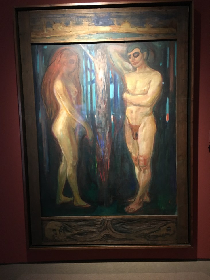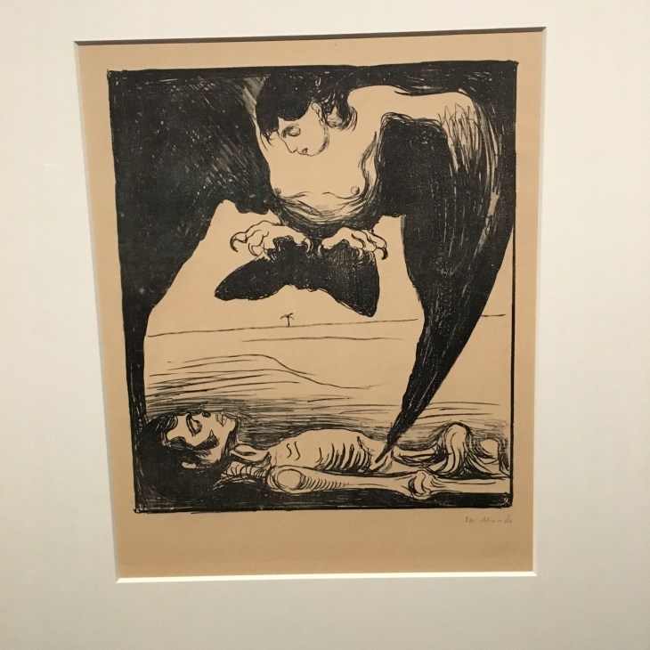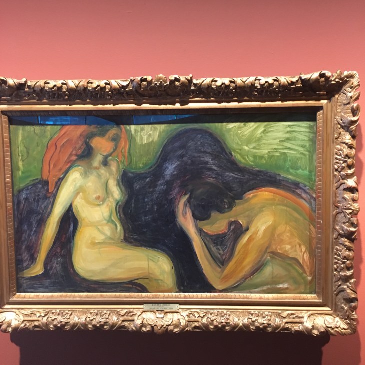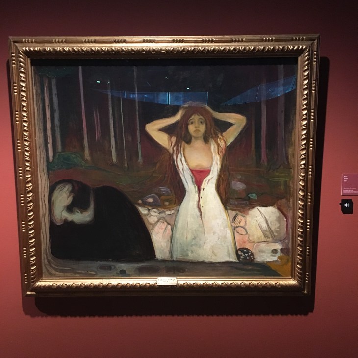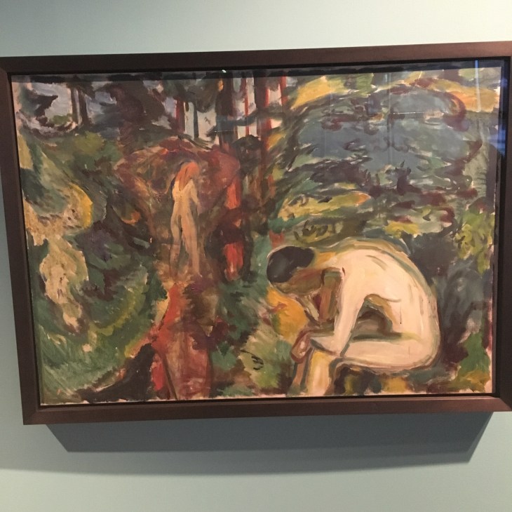 There are plenty of lone figures in Munch, even when paired with second, a third, a fourth, a fifth… The screamee, even with two companions walking on, the variants on Solitude: The Lonely Ones, a man and a woman on a beach, a distance between them. Then a woman dressing — possibly undressing, but I think not — as a man crouches, his head in his hands. Has she seduced him? Was it his first time? Could he perform? One version is called After the Fall, as if it is sin entering into the Garden of Eden. And let us not get started on the harpies or the women with skeletons (the works are usually translated as “and” even if it’s “meg” or “with”).