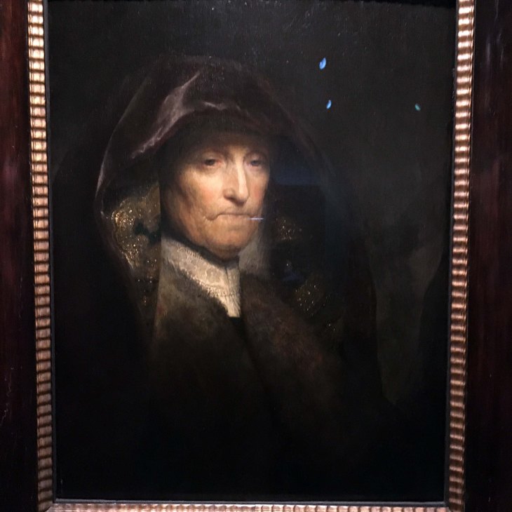 This early self-portrait says rock artist produces solo album — the clever shadowing of his eyes, the complexity of the curly hair, and all the more striking for being a small painting. In his paintings and especially his etchings he practices and practices such images, and seems to love to dress up. He also paints his family, especially his father and mother. It’s assumed that Old Woman, with the golden threads in her hood, her starched collar and fury jacket, is his mother, Neeltgen Willensdr, and you might imagine she’d be happy to sit for a telented son, if not necessarily flattered by the image. But it might be a tronie, an artistic type, rather than a faithful reproduction.