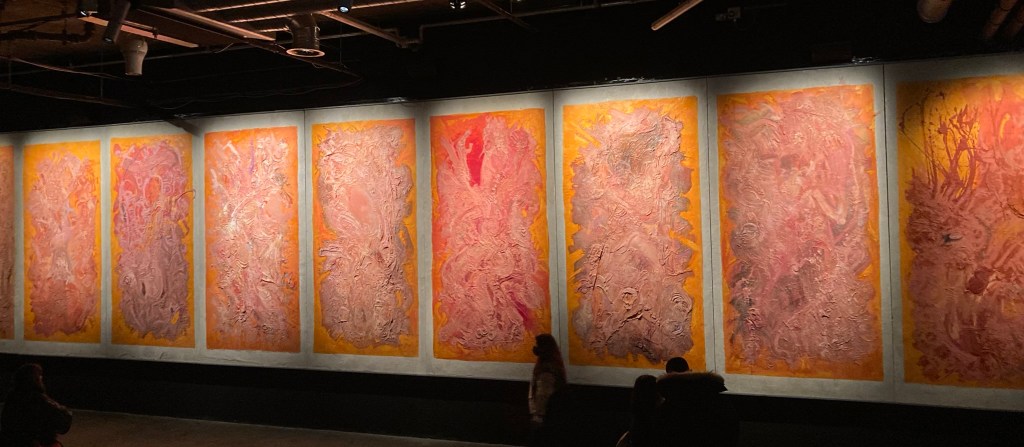 We see notebooks and typewriters, layout boards for the magazine, Rosenthaler’s iconic paintings, and piles of faked French paperbacks. There was a good hour of browsing, admiring the craft, trying not to fetishize it too much. And then, I think with a wink, a recreation of the film’s café.